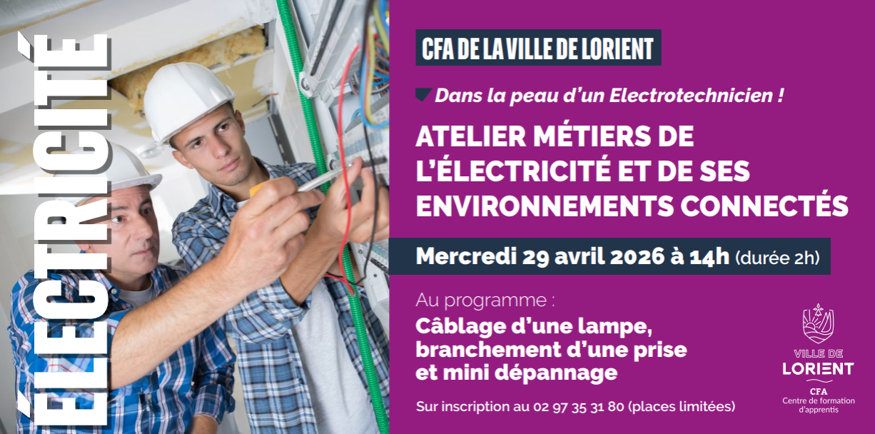 Le CFA de la Ville de Lorient vous propose un atelier "Dans la peau d'un électrotechnicien" le mercredi 29 avril 2026 à 14h dans ses locaux.